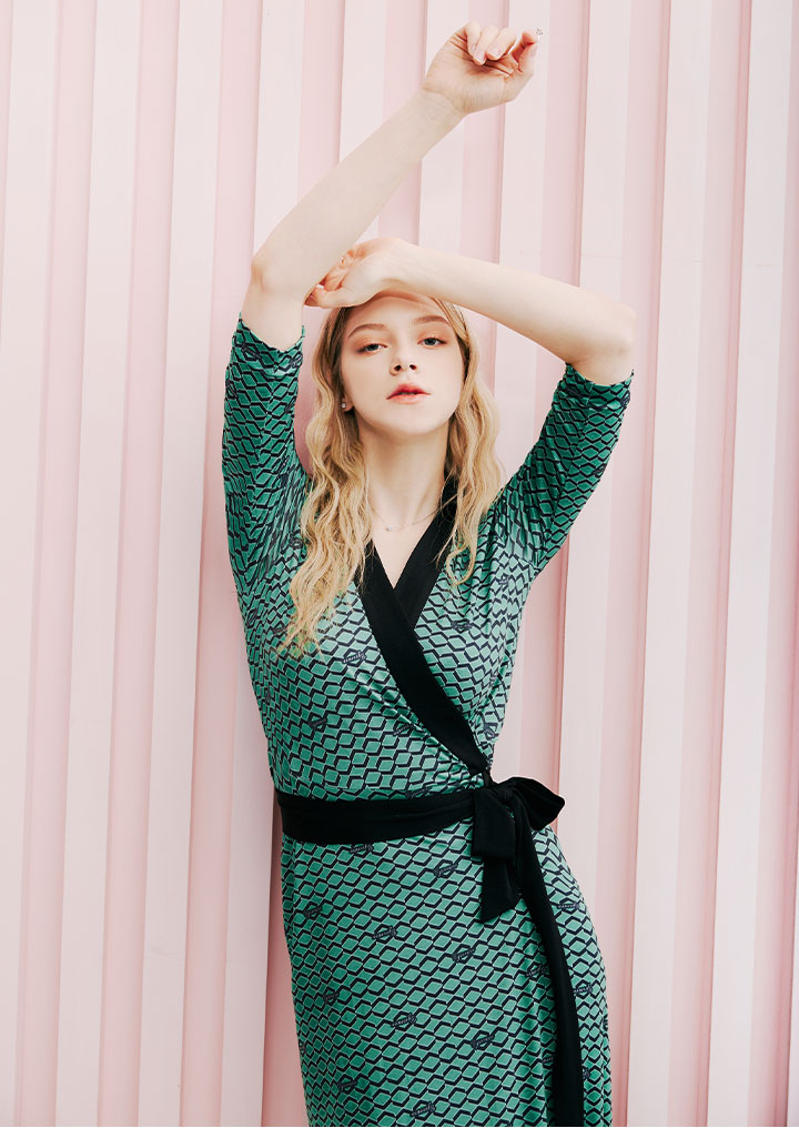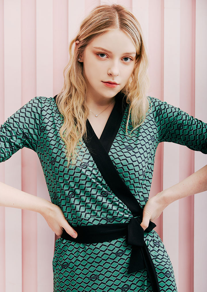 차분한 그린 컬러에 매력적인 패턴이 조화로운 랩 원피스입니다