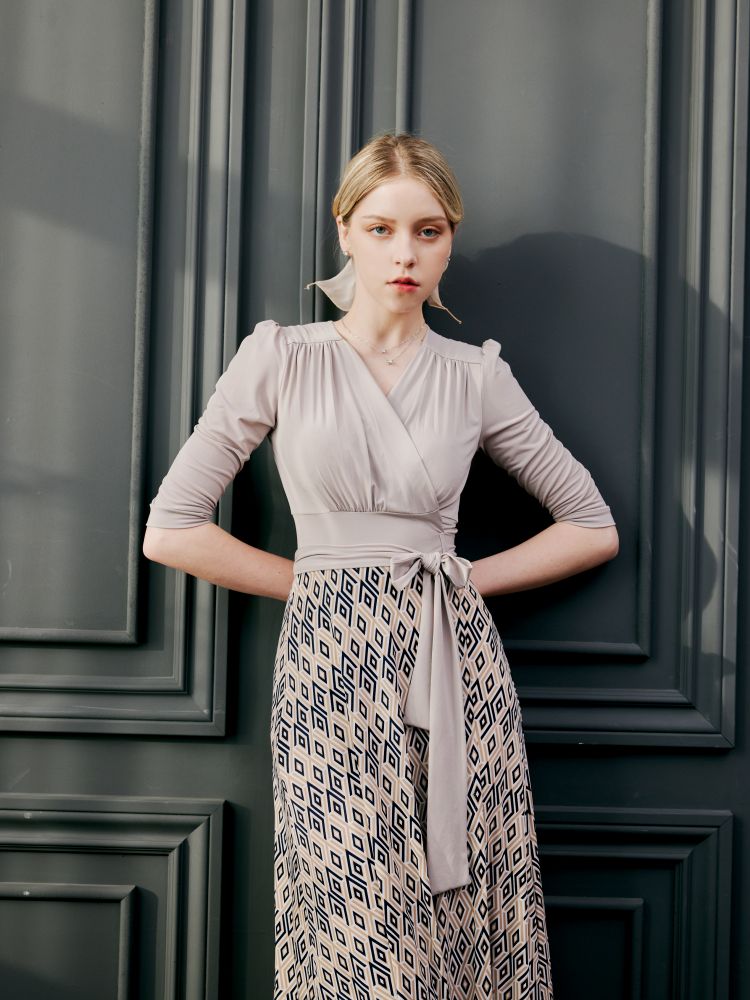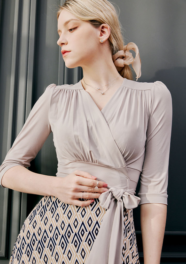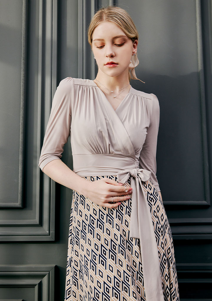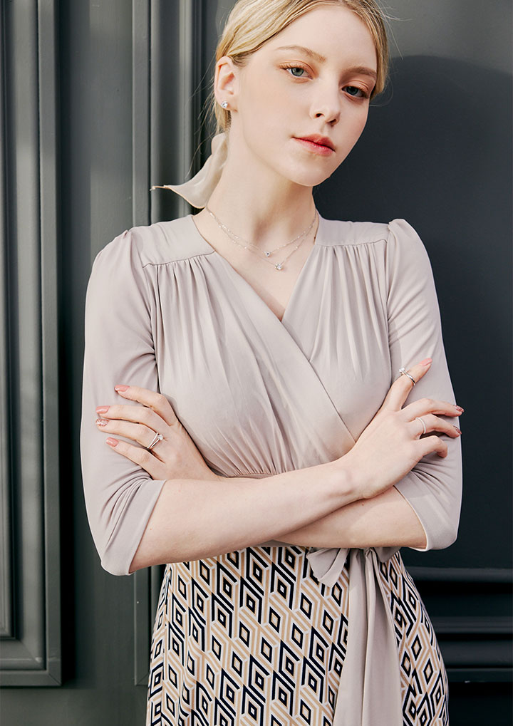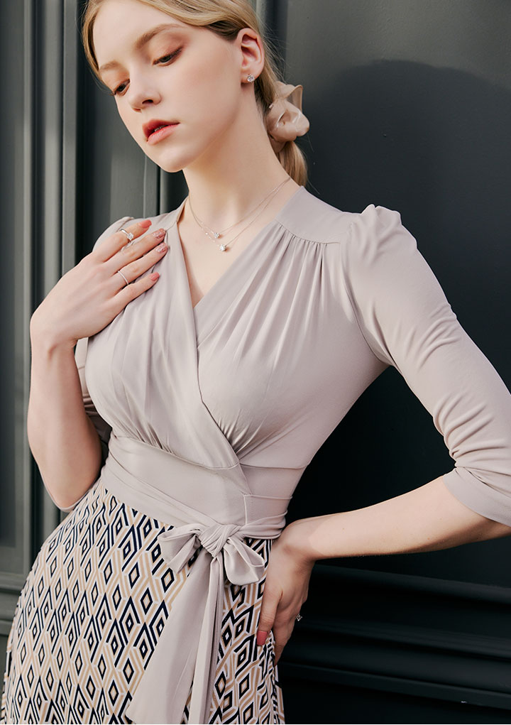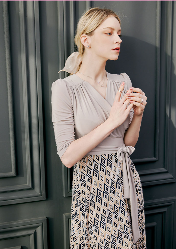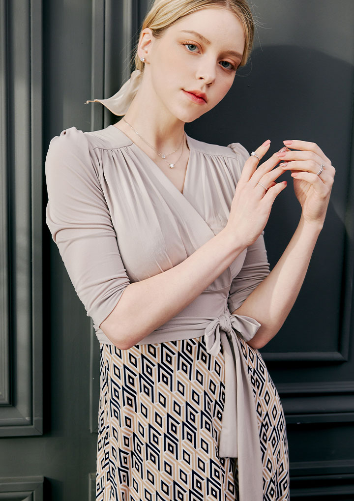 은은한 베이지 컬러에 기하학 무늬가 여성스럽게 매치된 랩 원피스 입니다