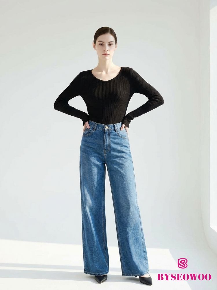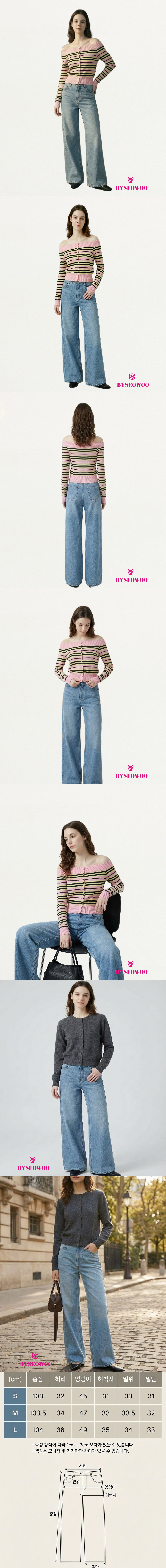 은은하게 번지는 워싱이 매력적인 연한 데님의 와이드 부츠컷 데님입니다.